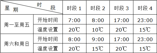 請注意:下表為"5+2"制熱編程模式下時段的開始時間與溫度初始數值表。