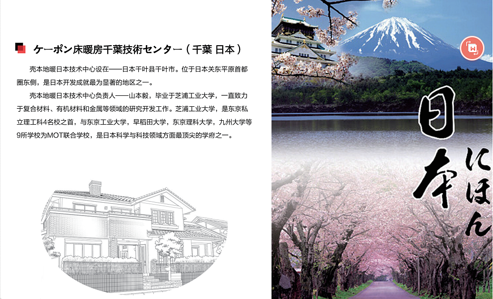 殼本地暖——日本技術中心位于日本千葉。負責殼本地暖的技術研發和地暖解決方案的革新設計,通過科研技術提升殼本地暖的品質和滿足更多用戶的需求。千葉縣(Chiba-ken),位于日本關東平原東南部,首都圈東側,人口占全日本第6位,建有成田國際機場、大型國際會議中心——幕張展館、東京迪斯尼樂園、“啦啦寶都”購物中心、三井奧特萊斯購物城等大型設施,是日本開發成顯著的地區之一。